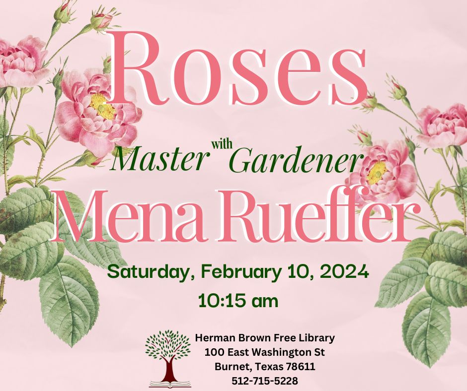 The library is thrilled to welcome back Master Gardner Mena Rueffer! Come learn all about Roses and how to grow them in the Texas Hill Country.