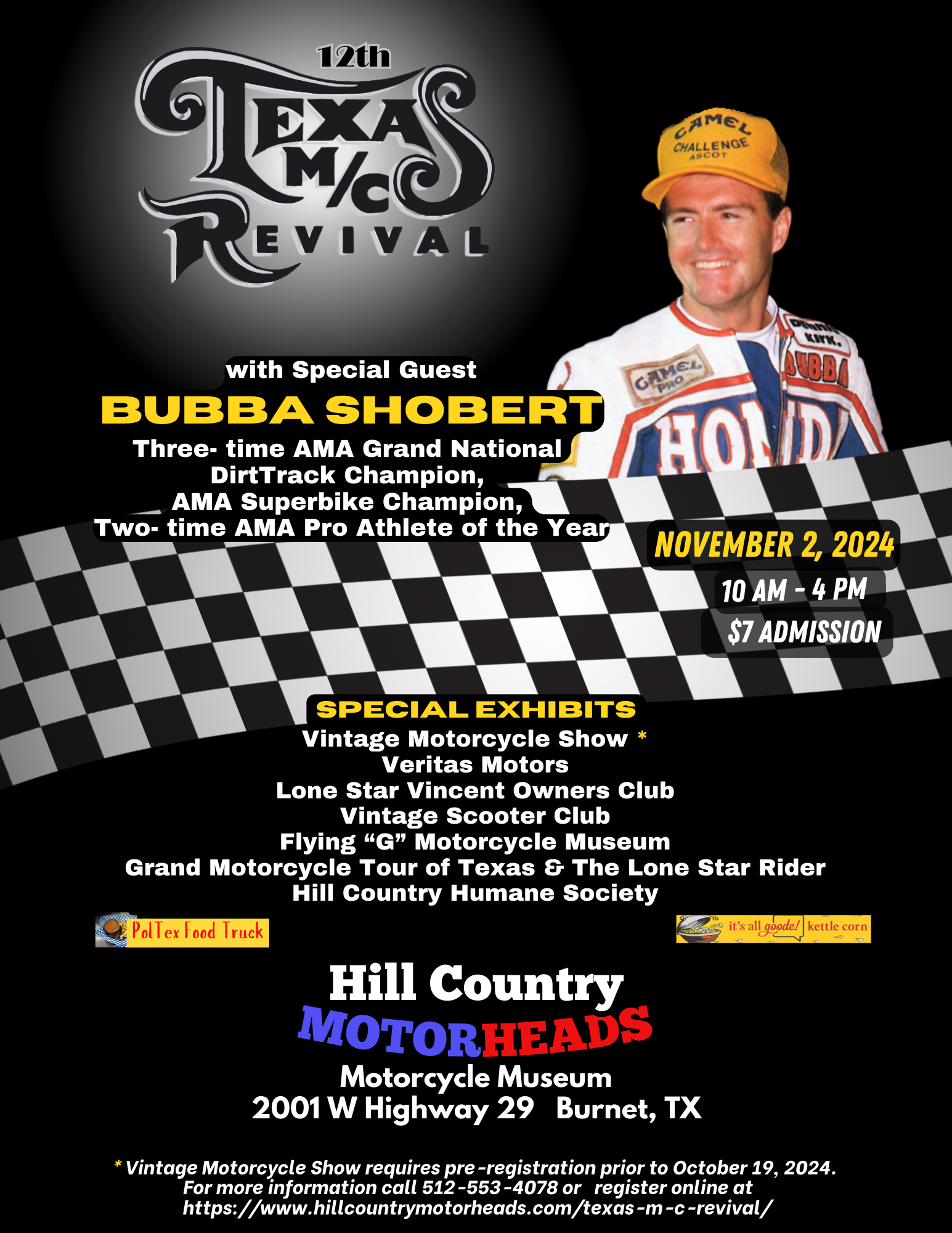 “Keeping the vintage motorcycle scene alive” is how Italian scooter owner Phil Jeffrey describes the 12th Texas Motorcycle Revival, scheduled for Saturday, November 2, 2024. Held on the grounds of Hill Country Motorheads Motorcycle Museum, the Texas Motorcycle Revival has become the premier fall Texas classic motorcycle event with the motorcycle show displaying over 175 bikes and includes something for everyone – scooters and minibikes to rarely seen or even heard of pre-war bikes. The museum is located at 2001 W Hwy 29 in Burnet, TX. Gates open at 10 am and $7 admission includes the motorcycle show, the museum’s diverse motorcycle collection, food vendors and special exhibits and guests. Texas Motorcycle Revival is family friendly and leashed pets are welcome. A major highlight of this year’s Texas Motorcycle Revival will be special guest Lubbock, TX native Bubba Shobert, a three-time AMA Grand National dirt-track champion (1985-1987) and AMA Superbike champion (1988).