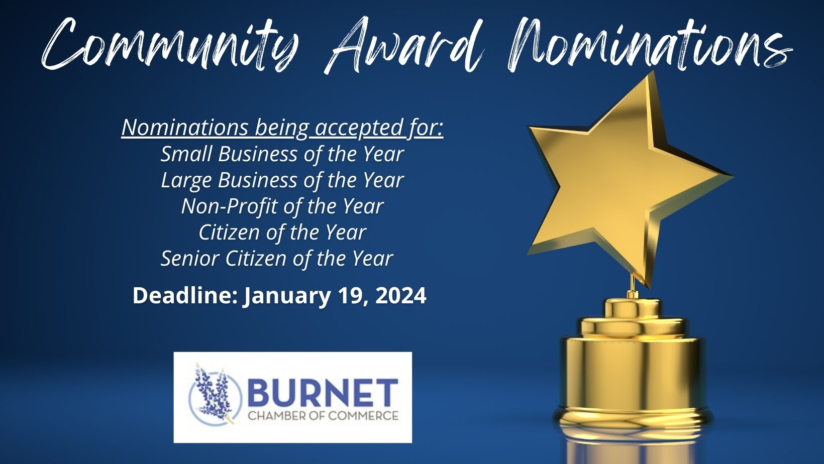 The Burnet Chamber of Commerce seeks nominations for community awards to be given out at the Annual Awards Banquet on Feb. 24, 2024. The deadline to submit your nomination is […]