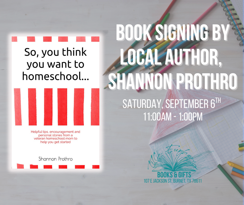 Join us at Title Euphoria Books & Gifts to visit with local author, Shannon Prothro, about her book 'So You Think You Want To Homeschool'. Veteran homeschool mom and author, Shannon Prothro, brings you candid and simple answers from some of the most common questions she has received from others during her homeschool journey. In […]